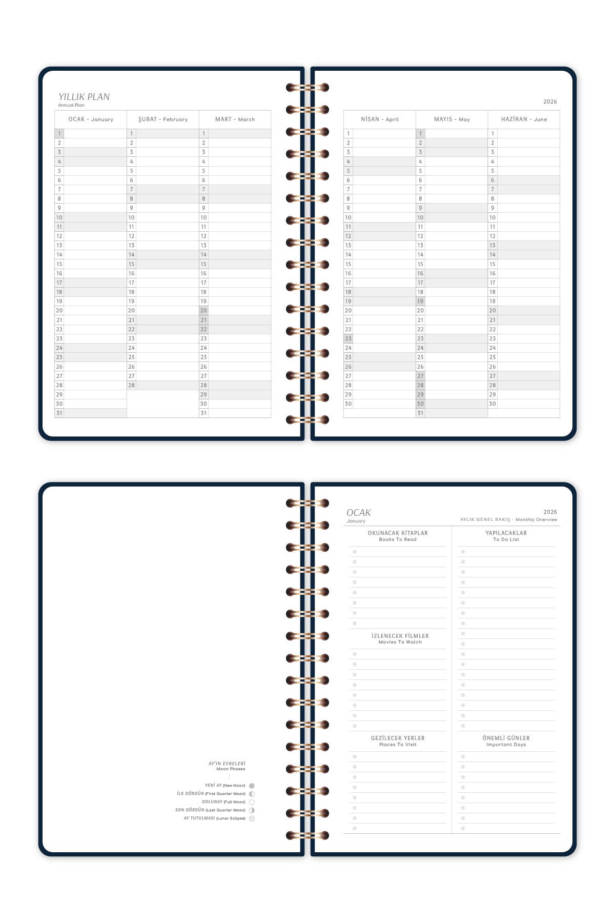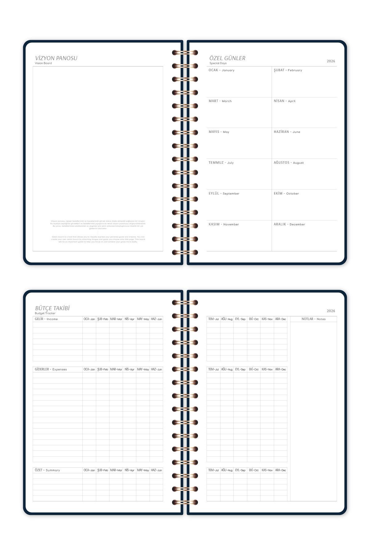 Ajandanın  Yıllık Hedefler kısmı, 2026 yılına dair hedeflerinizi kâğıda dökmenize imkân tanır. Hedeflerinizi somut hale getirerek yıl boyunca odaklanmanızı kolaylaştırır.