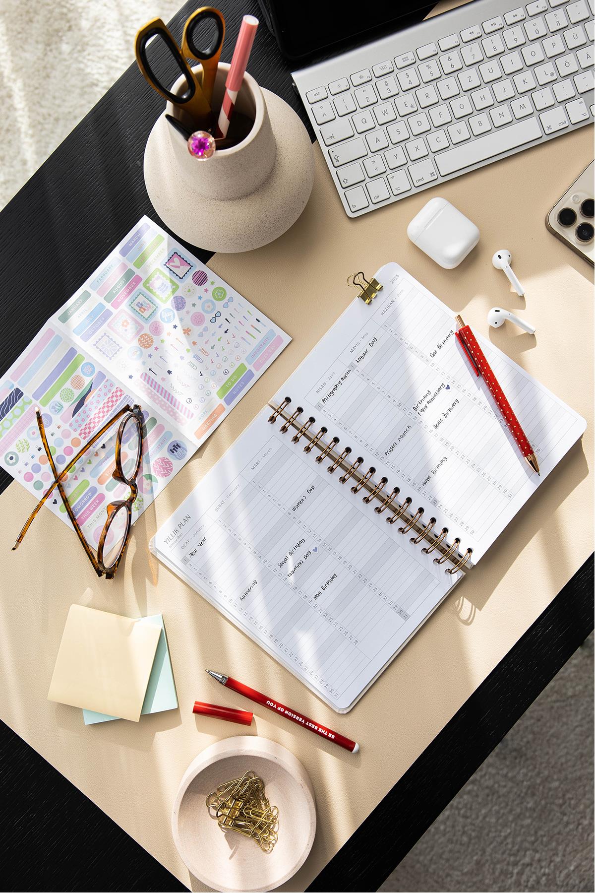 ✦ Ajandanın haftalık plan sayfaları, haftanın günlerini ve önceliklerini görmenizi sağlar. Görevlerinizi, toplantılarınızı veya kişisel notlarınızı düzenli bir biçimde kaydedebilir; hafta boyunca yapılacakları etkili şekilde takip edebilirsiniz.