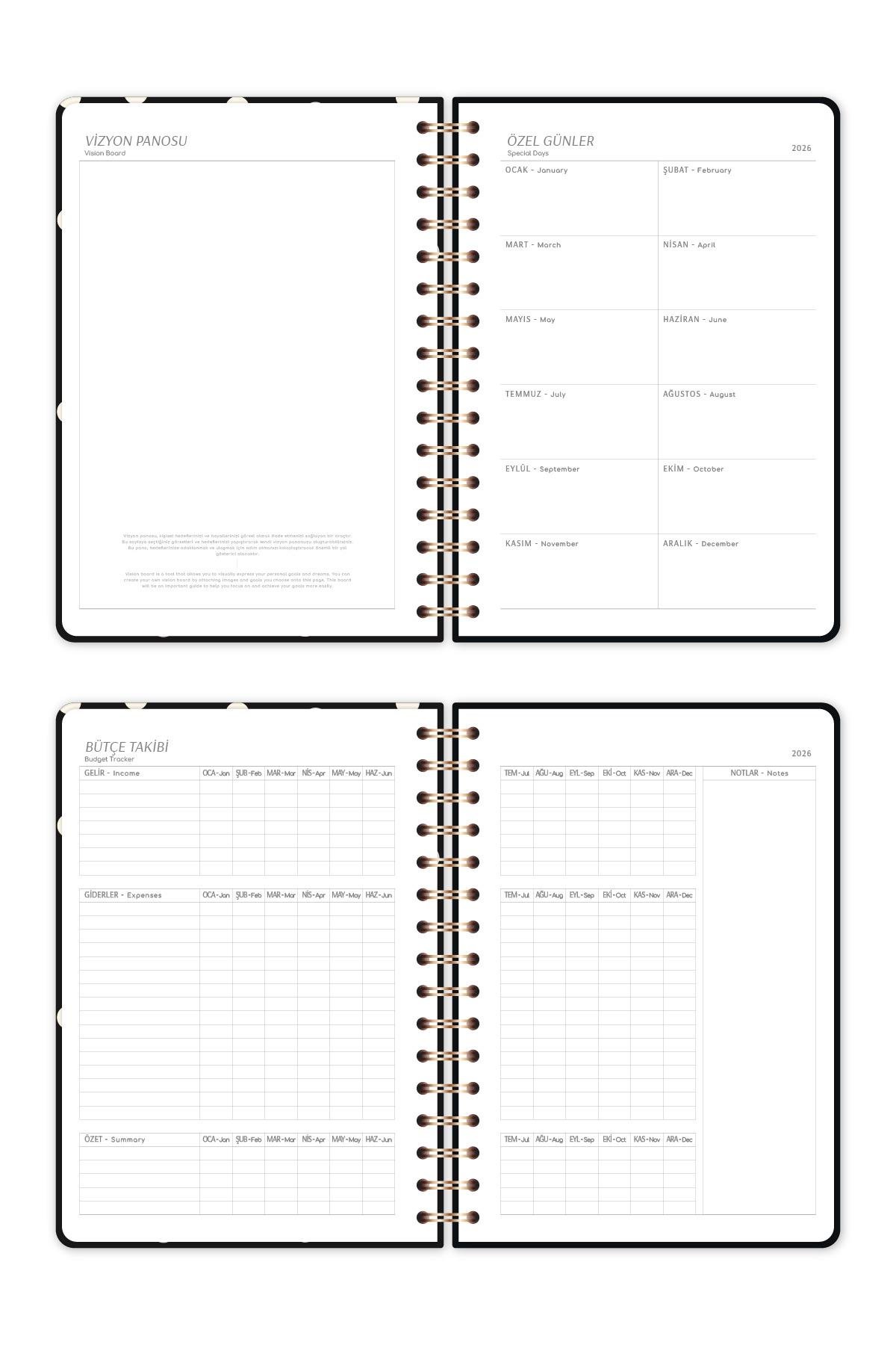✦ Ajandanın Yıllık Hedefler kısmı, 2026 yılına dair hedeflerinizi kâğıda dökmenize imkân tanır. Hedeflerinizi somut hale getirerek yıl boyunca odaklanmanızı kolaylaştırır.