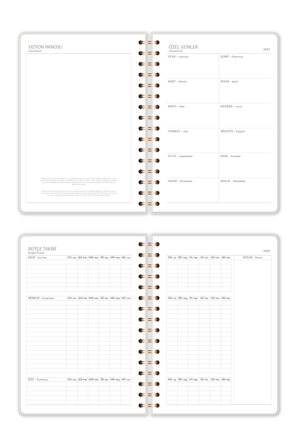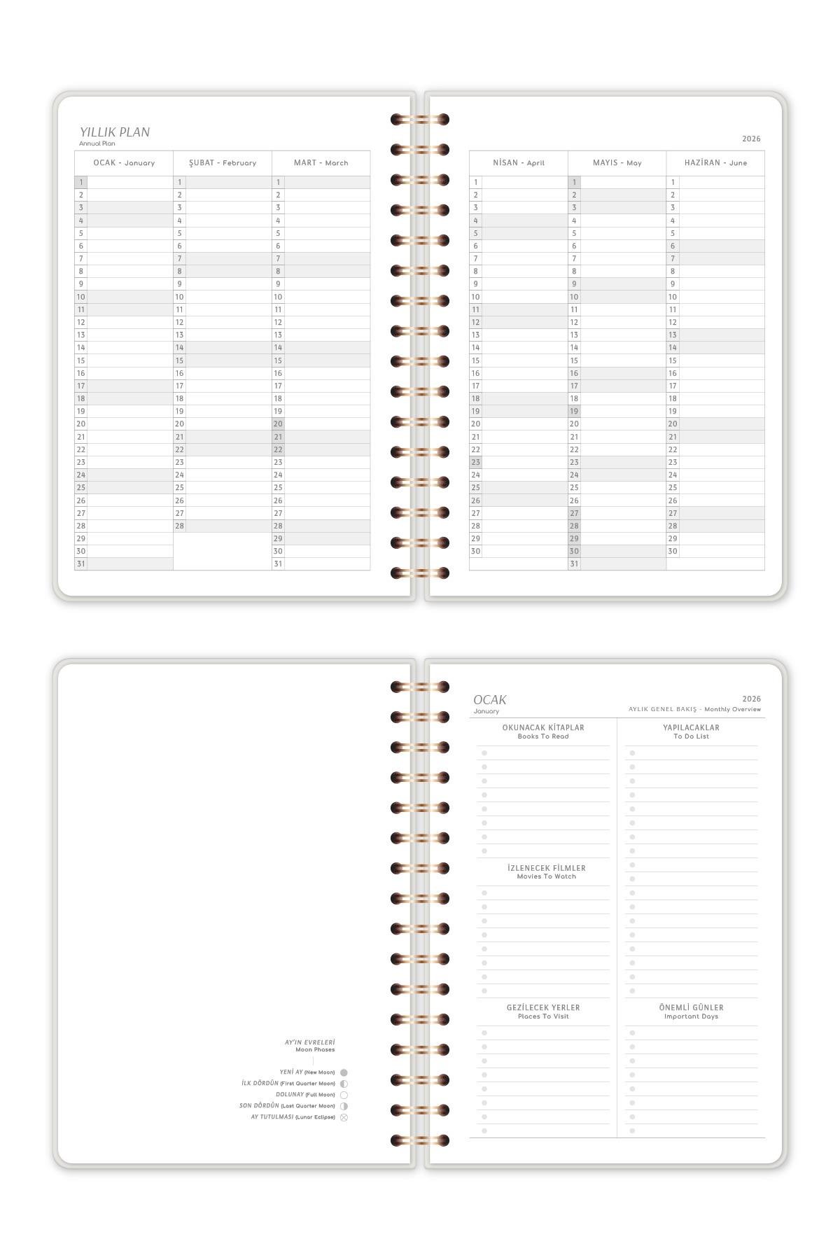 Ajandanın Yıllık Hedefler kısmı, 2026 yılına dair hedeflerinizi kâğıda dökmenize imkân tanır. Hedeflerinizi somut hale getirerek yıl boyunca odaklanmanızı kolaylaştırır.