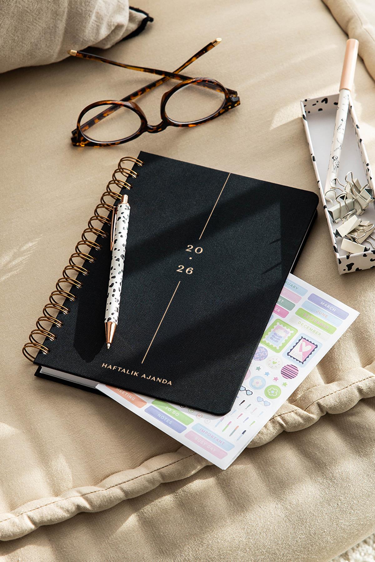 Ajandanın haftalık plan sayfaları, haftanın günlerini ve önceliklerini görmenizi sağlar. Görevlerinizi, toplantılarınızı veya kişisel notlarınızı düzenli bir biçimde kaydedebilir; hafta boyunca yapılacakları etkili şekilde takip edebilirsiniz.