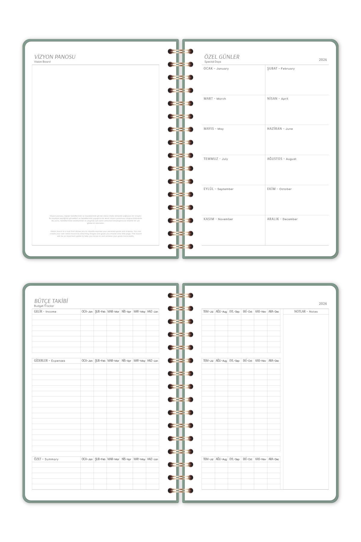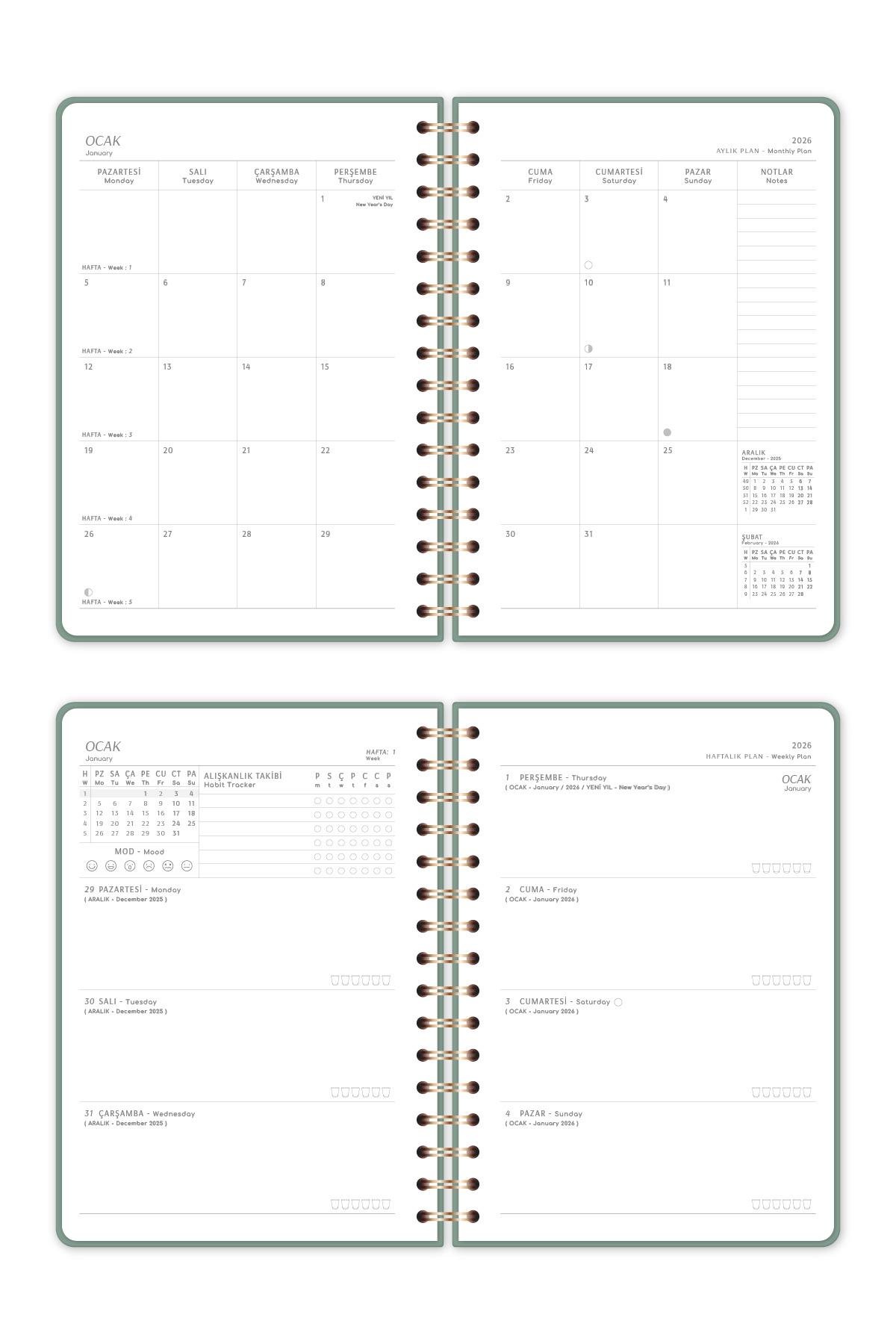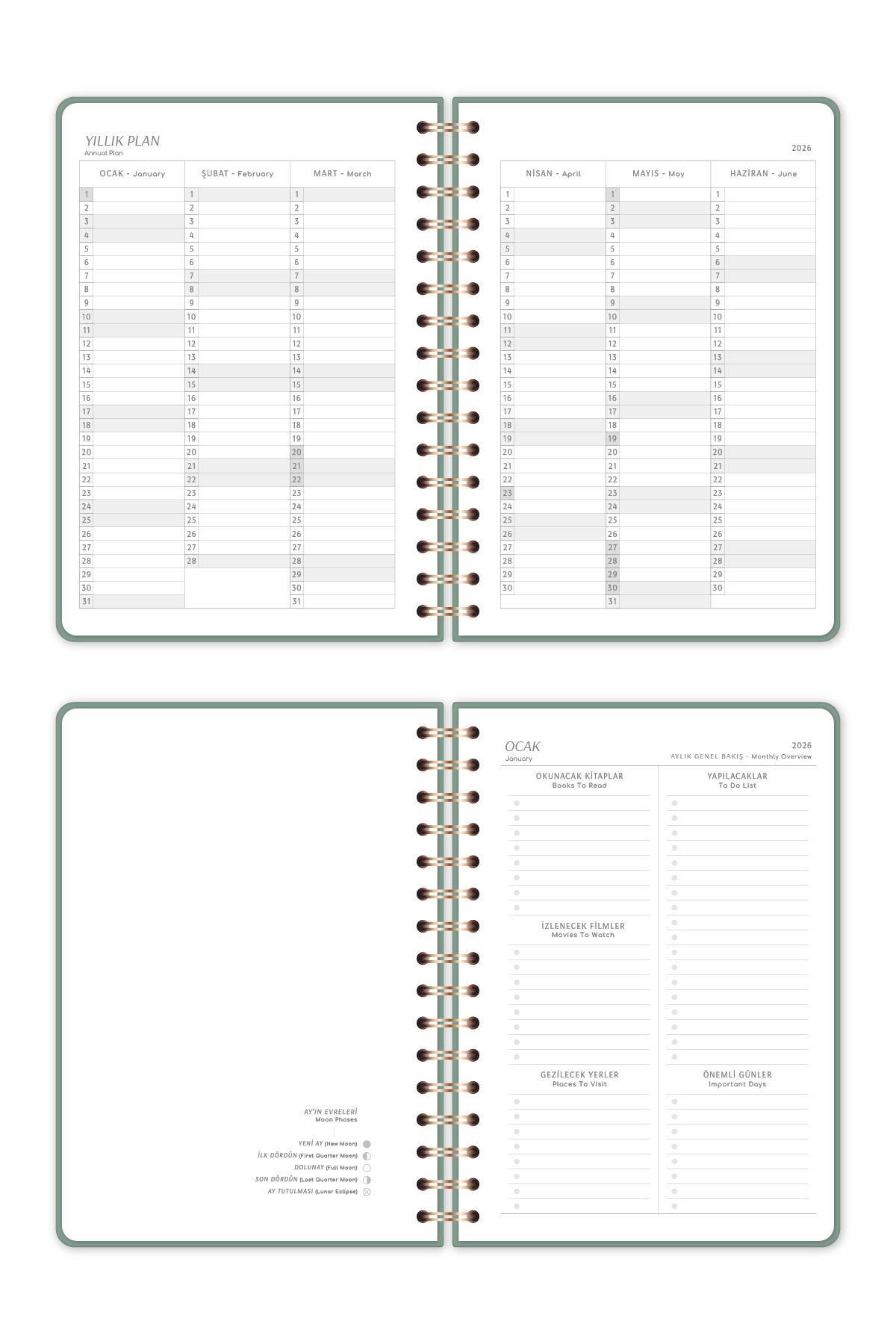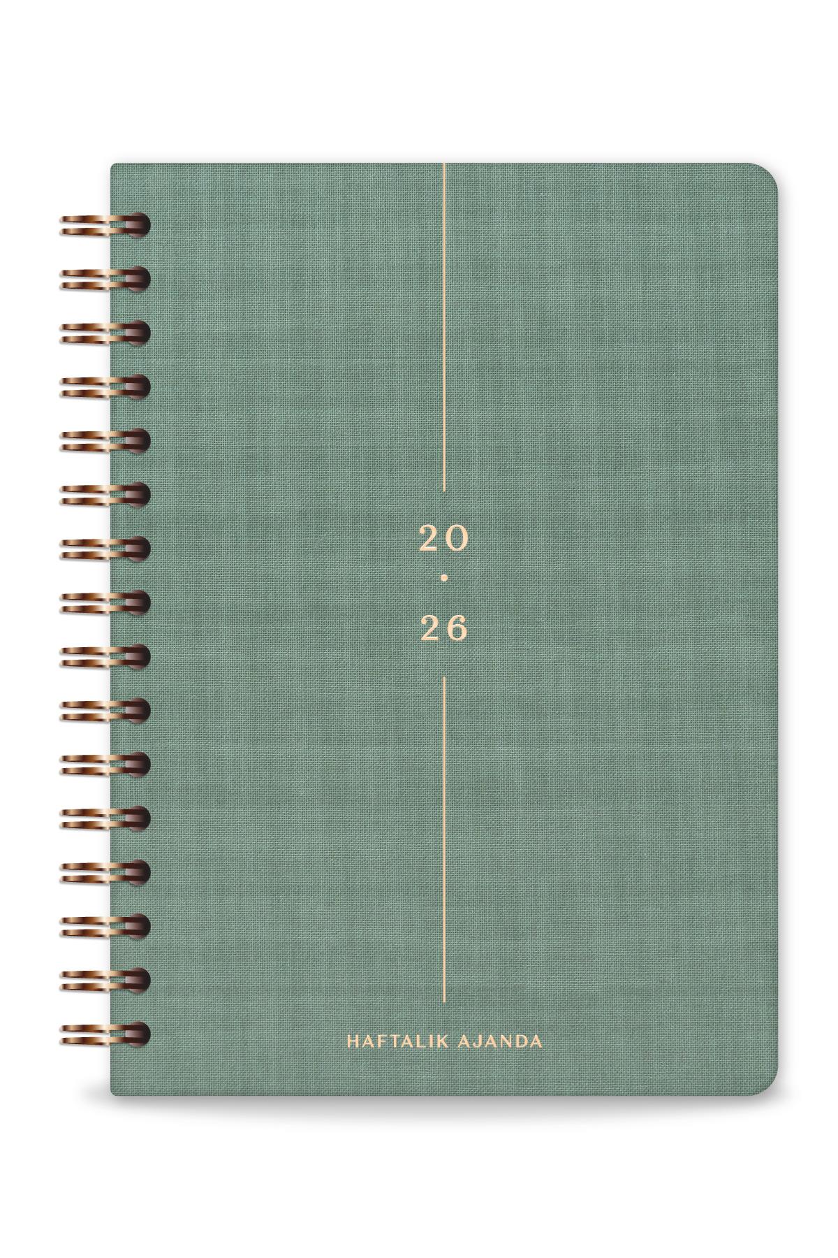 2026 A5 Spiralli Keten Haftalık Ajanda 12 Aylık - Yeşil