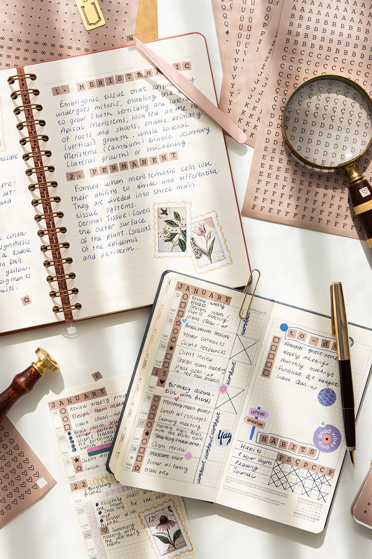 Her sayfada, harf, rakam ve sembol stickerları bulunur. Bu sayede ajandalarınıza başlıklar ekleyebilir, notlarınızı vurgulayabilir ve sayfa düzeninizi tasarlayabilirsiniz..