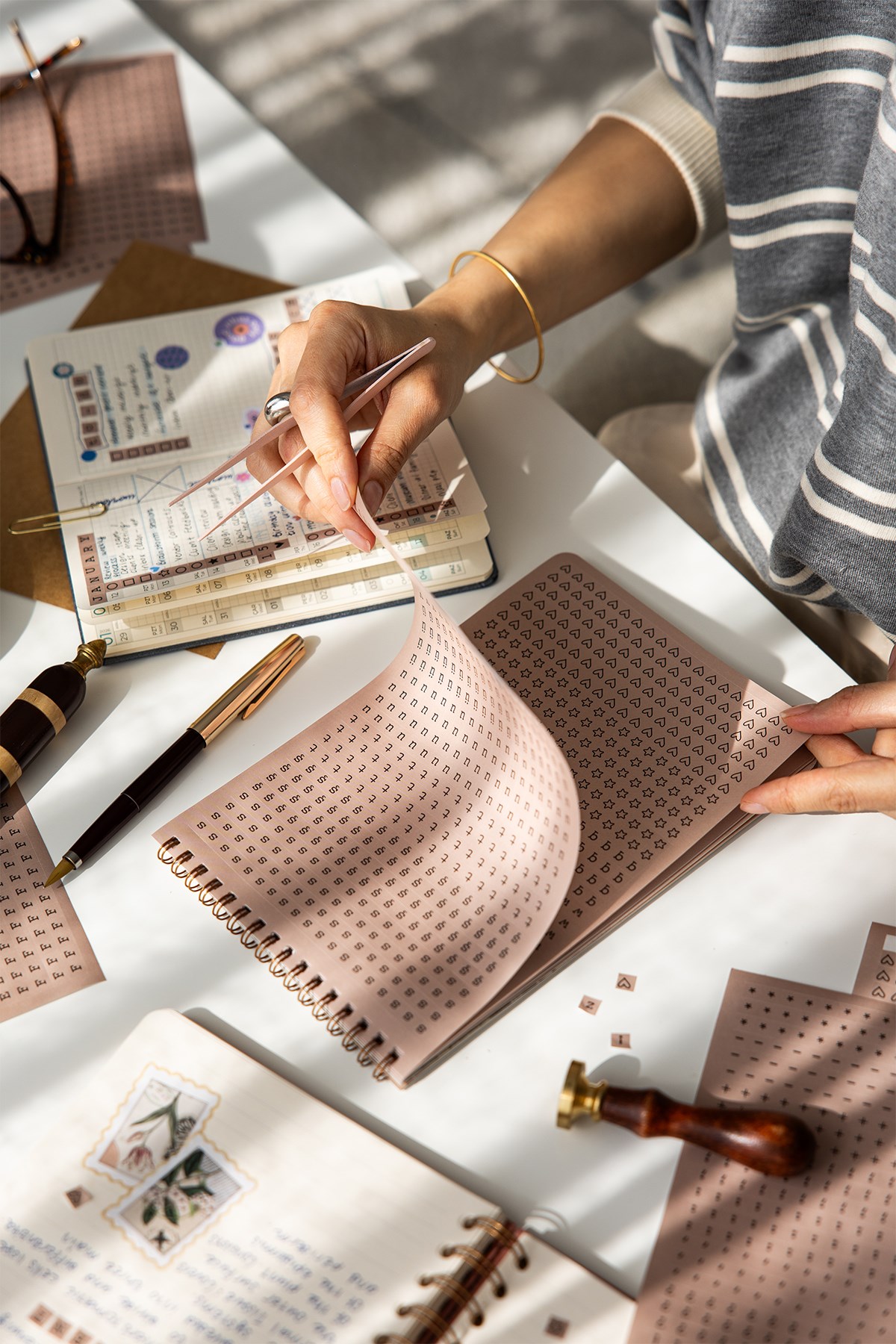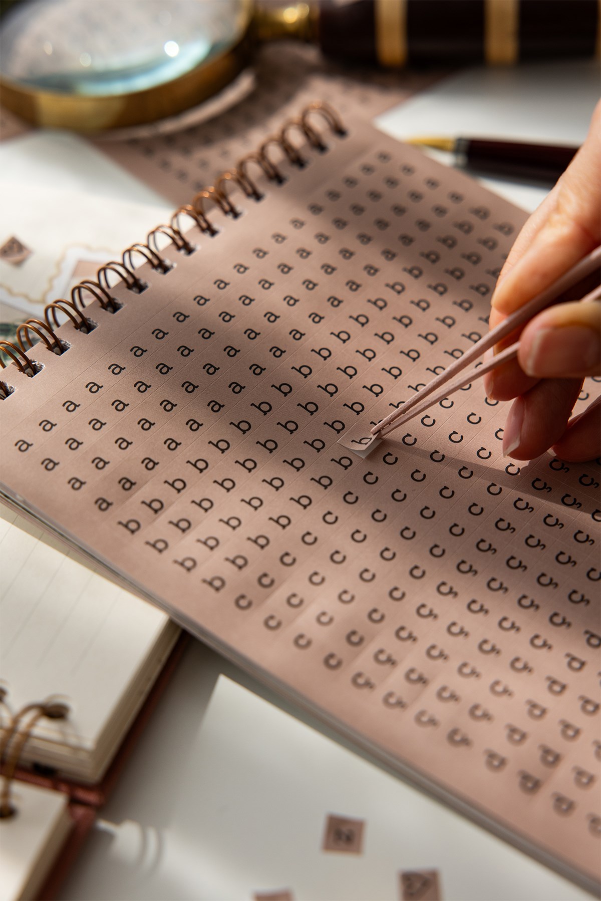 Defterin içerisinde yüzlerce harf, rakam ve noktalama işareti stickerı mevcuttur. Böylece yazılarınızı vurgulayabilir, başlıklar oluşturabilir veya kendi el yazınızı destekleyen özgün düzenlemeler yapabilirsiniz.