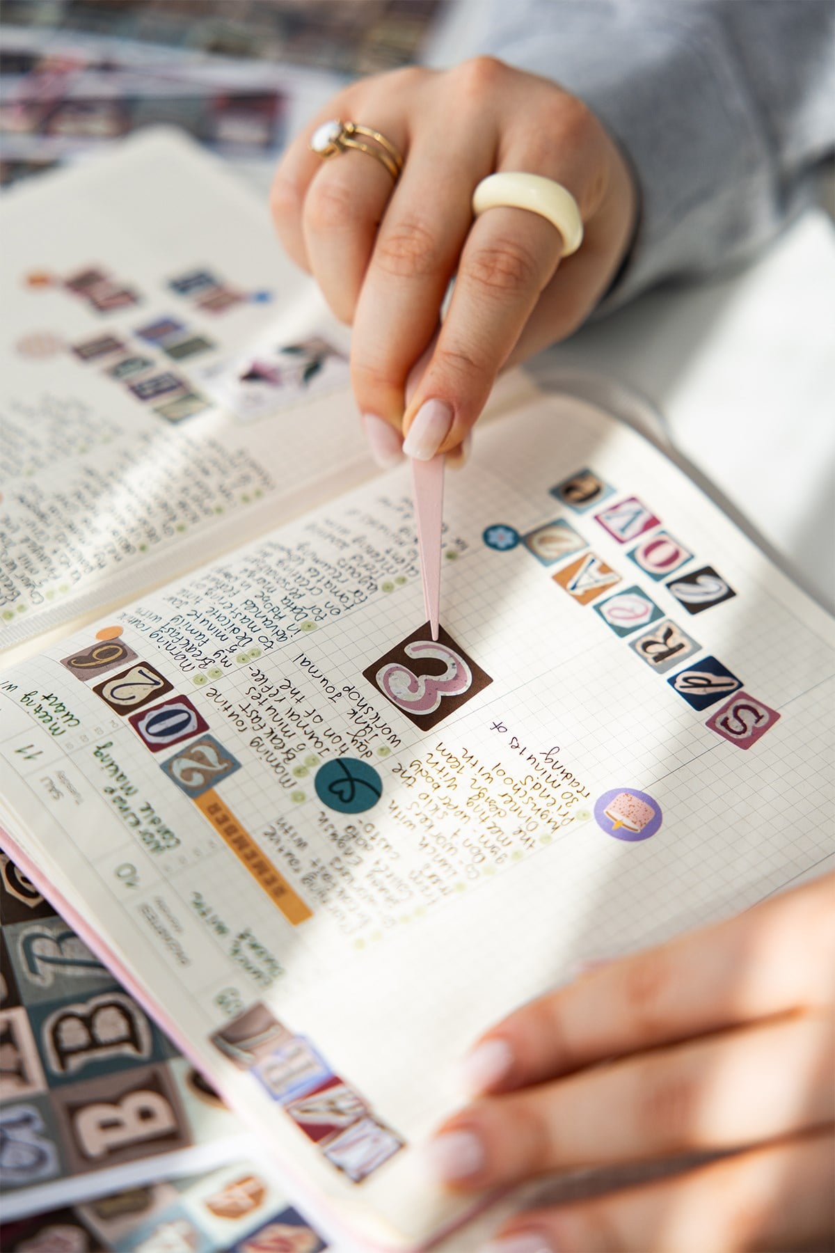 Her sayfada, farklı font ve renk kombinasyonlarında hazırlanmış harf, rakam ve sembol stickerları bulunur. Bu sayede ajandalarınıza başlıklar ekleyebilir, notlarınızı vurgulayabilir ve sayfa düzeninizi kişisel zevkinize göre renklendirebilirsiniz.